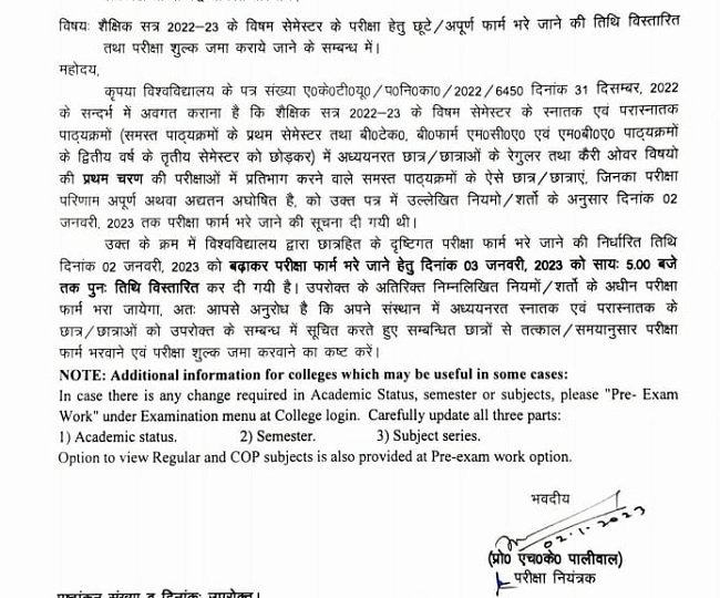 शैक्षिक सत्र 2022-23 के विषम सेमेस्टर के परीक्षा के लिए छूटे अथवा अपूर्ण फार्म को फिर से भरे जाने की तिथि को बढ़ा दिया गया है। इस सम्बंध में परीक्षा नियंत्रक प्रो. एचके पालीवाल ने विश्वविद्यालय से सम्बद्ध सभी संस्थाओं को निर्देश जारी किया है। विद्यार्थी अब छूटे फार्म 3 जनवरी की शाम 5 बजे तक भर सकते हैं। इसी के साथ परीक्षा शुक्ल जमा करवाने के लिए भी निर्देश दिए गए हैं।