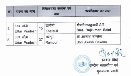 भाजपा ने उपचुनाव के लिए उम्मीदवारों की सूची मंगलवार को जारी कर दी है। पूर्व सांसद रघुराज सिंह शाक्य मैनपुरी लोकसभा से भाजपा उम्मीदवार होंगे और मुलायम सिंह की बहू को उनके ही गढ़ में टक्कर देंगे। तो वहीं रामपुर विधानसभा से आकाश सक्सेना उम्मीदवार होगे, खतौली विधानसभा से राजकुमारी सैनी उम्मीदवार और बिहार के कुरहानी से केदार प्रसाद गुप्ता उम्मीदवार होंगे।