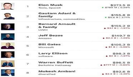 भारत के लिए यह खुशी की खबर है कि देश के जाने-माने बिजनेसमैन गौतम अडानी ने इतिहास रचते हुए दुनिया के दूसरे सबसे अमीर व्यक्ति बन गए हैं। पहले नम्बर पर एलन मस्क हैं तो वहीं बिल गेट्स पांचवे नम्बर पर पहुंच गए हैं जो कि कभी पहले नम्बर पर हुआ करते थे। दुनिया के टॉप 10 अमीरों की सूची फोर्ब्स रियल टाइम बिलेनियर इंडेक्स द्वारा जारी की गई है, जिसमें आठवें नम्बर पर भारत के मुकेश अम्बानी ने स्थान पाया है।