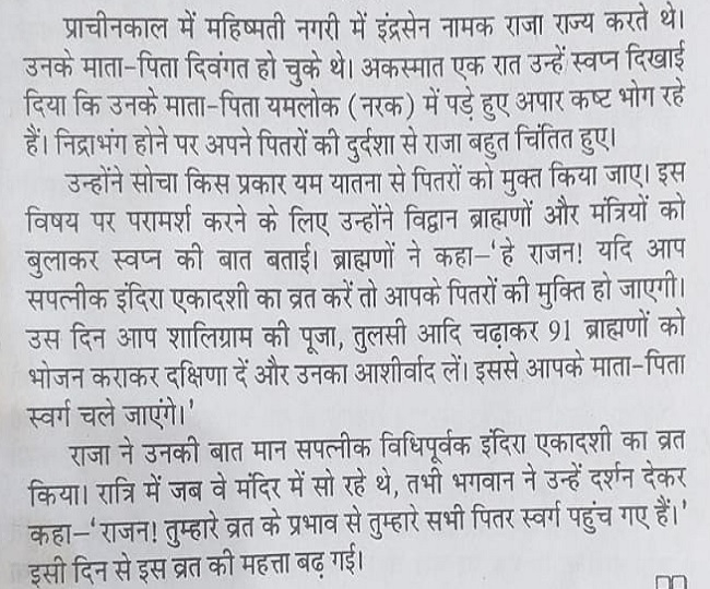 एकदशी विशेष। अश्विन कृष्ण एकादशी को इंदिरा एकादशी कहते हैं। इस बार इस इंदिरा एकादशी का व्रत 21 सितम्बर को पड़ रहा है। शास्त्रों में बताया गया है कि भटकते हुए पितरों को गति देने वाली पितृपक्ष की इस एकादशी का नाम इंदिरा एकादशी है। इस एकदशी का व्रत करने वाले के सात पीढ़ियों तक के पितृ तर जाते हैं। इस एकादशी का व्रत करने वाला स्वंय मोक्ष प्राप्त करता है।