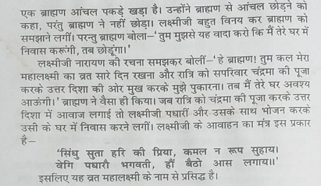 इस दिन सबसे पहले लक्ष्मीजी की प्रतिमा को पंचामृत से स्नान कराएं। फिर नए-नए वस्त्र पहनाकर उनको भोग लगाएं और फिर आचमन कराकर फूल, फल, धूप, दीप, चंदन आदि से आरती करें तथा भोग को आरती के बाद बांट दें। इस दिन पूरे दिन व्रत करके। रात्रि को चंद्रमा के निकलने पर उसे अर्घ्य देकर व पूजन करके भोजन करें। इस व्रत को करने से धन-धान्य की वृद्धि होती है और सुख मिलता है।