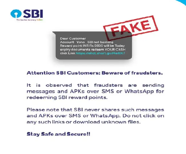 भारतीय स्टेट बैंक (SBI) ने अपने ग्राहकों को चेतावनी देते हुए कहा है कि कुछ लोग SBI के नाम पर नकली मैसेज भेज रहे हैं. ये मैसेज Whatsapp और एसएमएस के माध्यम से भेजे जा रहे हैं. इन मैसेज में कहा जा रहा है कि आपके एसबीआई रिवार्ड पॉइंट्स जल्द ही खत्म हो जाएंगे. ऐसे में उन्हें जल्द से जल्द रिडीम कर लें. बैंक ने ये भी कहा है कि मैसेज में एक लिंक भी दिया गया है. मालूम हो कि SBI ने सोशल मीडिया प्लेटफॉर्म एक्स पर एक पोस्ट शेयर कर अपने ग्राहकों को इसके बारे में जानकारी दी है और कहा है कि बैंक कभी भी इस तरह के मैसेज नहीं भेजता है. इसलिए ग्राहक ऐसे किसी भी लिंक पर क्लिक ना करें.