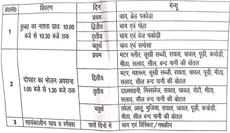 चार दिन की ट्रेनिंग के हिसाब से पहले नाश्ते में दिन चाय़ और ब्रेड पकौड़ा, दूसरे दिन चाय और पोहा, तीसरे दिन चाय और वेज पकोड़ी, चौथे दिन चाय और समोसा, तो वहीं भोजन में पहले दिन मटर-पनीर के साथ सूखी सब्जी, रायता, चावल, पूड़ी-कचौड़ी, मीठा, सलाद, सील बंद पानी की बोतल। दूसरे दिन मटर मसरूम, सूखी सब्जी, रायता, चावल, पूड़ी, कोई मिठाई, सलाद, सील बंद पानी की बोतल, तीसरे दिन मेन्यू में दाल मखनी, मिक्स वेज, रायता, चावल- रोटी, मीठा, सलाद सील बंद पानी की बोतल और चौथे दिन छोला, आलू भुजिया, रायता, चावल, पूड़ी- कचौड़ी, मीठा, सील बंद पानी की बोतल, तो वहीं चारो दिन शाम की चाय के साथ कुछ न कुछ स्नैक्स को निर्धारित किया गया है।