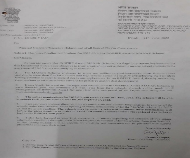 बता दें कि केंद्र सरकार के इंस्पायर अवार्ड मानक योजना 2022-23 (बेस्ट आईडिया कम्पीटीशन) नामांकन 1 जुलाई 22 से प्रारम्भ हो रहा है और इसकी अन्तिम तिथि 30 सितम्बर 2022 निर्धारित की गई है। इंस्पायर अवार्ड मानक योजना के अंतर्गत कक्षा 6 से 10 तक अध्ययनरत समस्त बोर्ड के छात्र- छात्राओं द्वारा विज्ञान एवं तकनीकी में नवाचारी (इन्नोवेटिव) प्रस्ताव पोर्टल पर आनलाईन प्रेषित किए जाते हैं| स्कूलों के लिए पोर्टल 1 जुलाई से सक्रिय हो जाएगा प्रत्येक विद्यालय इंस्पायर अवार्ड मानक पोर्टल पर बनी अपनी स्कूल आईडी को लॉग इन करते हुए पात्र छात्र- छात्राओं के नामांकन करवा सकते हैं।