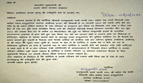 सोशल मीडिया पर एक पत्र वायरल हो रहा है, जिसमें एक ब्राह्मण परिवार ने सपरिवार इच्छा मृत्यु की मांग मुख्यमंत्री योगी आदित्यनाथ से की है। यह पत्र 22 जुलाई 2022 का है। इस पत्र को राजकुमारी शर्मा पत्नी स्वर्गीय महेश चंद्र शर्मा द्वारा लिखा गया है, जो कि गांव बरौठा, थाना हरदुआगंज, जिला अलीगढ़ उत्तर प्रदेश (UP) की निवासी है। उनकी एक पुत्री और दो बेटे हैं।