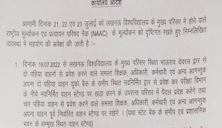 LU: NAAC मूल्यांकन को देखते हुए लखनऊ विश्वविद्यालय के शिक्षकों, कर्मचारियों और विद्यार्थियों के लिए जारी किए गए नए दिशा-निर्देश, बदल दी गई वाहन स्टैंड सहित तमाम व्यवस्थाएं, पढ़ें पूरा आदेश