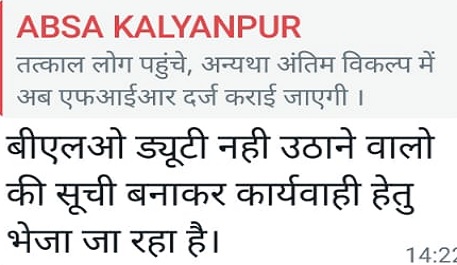 इससे ये साफ होता है कि जिला प्रशासन बेसिक शिक्षा विभाग के अधिकारियों से शिक्षकों और स्कूल की स्थितियों के बारे में कोई जानकारी नहीं ले रहा है। इसी दौरान एक मैसेज सोशल मीडिया पर वायरल हो रहा है, जो कि खंड शिक्षाधिकारी कल्याणपुर कानपुर का बताया जा रहा है। इस मैसेज में साफ लिखा है कि जो शिक्षक बीएलओ ड्यूटी नहीं उठाएगा, उसके खिलाफ रिपोर्ट दर्ज कराई जाएगी। इस सम्बंध में जिला बेसिक शिक्षाधिकारी सुरजीत सिंह ने कहा कि इस के बारे में कल्याणपुर खंड शिक्षाधिकारी से बात करेंगे। किसी भी शिक्षक पर रिपोर्ट दर्ज नहीं कराई जाएगी।