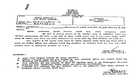 निगम के जोन 2 के जोनल अधिकारी ने इस पत्र की प्रति निगम के नगर अभियंता को इस अनुरोध के साथ भेजी है कि वे निर्धारित तिथि से पूर्व नियमानुसार चिन्हांकन करते हुए ट्रक, जेसीबी सहित स्टाफ तथा सहायक अभियंता को भी कार्यवाही के सम्बन्ध में निर्देश दें। इस पत्र की प्रति अपर नगर आयुक्त को सूचनार्थ तथा जोन 2 के कर अधीक्षक एवं राजस्व निरीक्षक को अतिक्रमण दस्ते सहित अभियान में उपस्थित रहकर सहयोग करने के लिए भेजी है।