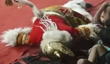 सोशल मीडिया पर एक वीडियो तेजी से वायरल हो है। जिसमें दिखाई दे रहा है कि भक्ति कार्यक्रम का आयोजन किया जा रहा है और भजन बज रहा है। बड़ी संख्या में लोग मौजूद हैं और भजन गीतों पर नाच गा रहे हैं। तो वहीं एक कलाकार हनुमान बनकर सभी को आशीर्वाद दे रहे हैं और नाच भी रहे हैं। इतने में वह गिर जाते हैं। तो उनका अभिनय जानकर लोग ताली बजाने लगते हैं। लोगों को लगता है कि वह कोई अभिनय कर रहे हैं, लेकिन वह अभिनय नहीं कर रहे थे। बच्चों के पास गिरे कलाकार ने कुछ बताने की भी कोशिश की लेकिन किसी ने भी ध्यान नहीं दिया।