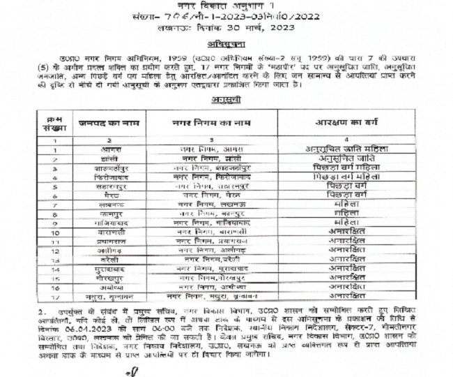 UP Nikay Chunav-2023: यूपी नगर निकाय चुनाव में आरक्षण सूची जारी, महिलाओं को दी गई प्राथमिकता, देखें कौन सी सीट किसके लिए हुई आरक्षित