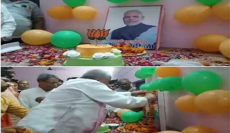सोशल मीडिया पर एक वीडियो तेजी से वायरल हो रहा है, जिसमें दिखाई दे रहा है कि मेज पर प्रधानमंत्री नरेंद्र मोदी की तस्वीर रखी हुई है और उसी के सामने केक रखा हुआ है। इसको देखकर लगता है कि कार्यक्रम प्रधानमंत्री के जन्मदिन (17 सितम्बर) का है। इस मौके पर भाजपा के अन्य कार्यकर्ता भी खड़े हैं।